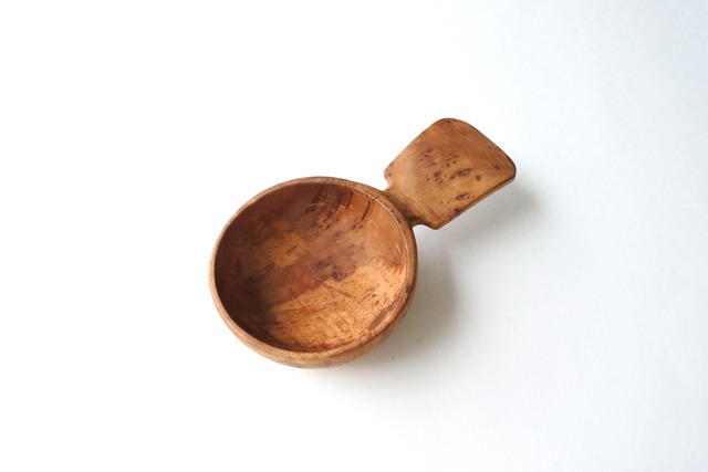 vintage visakoivu kuksa A / ヴィンテージ カーリーバーチのククサ A 樹幹が肥大し木目がカールしたように見える、visakoivu (ヴィサコイブ)と呼ばれる白樺で作った製品です。 突然変異により生じる素材でゆっくりと成長するため数が少なく、visakoivu製品はフィンランドでは特別なものとして珍重されてきました。 艶があり細かな木目やオーロラに例えられる色の濃淡がとても美しい品です。 お茶やコーヒーのメジャースプーンにもどうぞ。 size H 約4cm × W 約12.8cm × D 約6.7cm MADE IN FINLAND 実際に北欧の家庭で使用されていた古道具です。 特に気になる状態に関しましては商品説明と画像にてお伝えしていますが、使用感や傷、汚れや経年変化のあることをご理解の上でご購入頂けますようお願い致します。