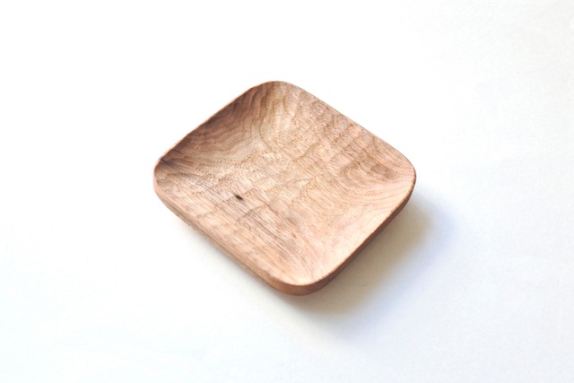 山口 和宏 胡桃の木の角皿 150×150 福岡県うきは市に工房を構え、温かみのある木工の道具を製作している山口和宏さんの手彫りのノミ跡が柔らかい雰囲気の四角いパン皿です。 適度に蒸気を吸いますので、トーストしたパンの表面をカリッと保ちます。 パン、果物はもちろんのこと、おにぎりや唐揚げなど水気の少ないお料理ならどんなものでもお使いいただけます。 色の染みる心配のないパスタなどにも。 材料には丸太から仕入れた胡桃の木を工房で十分に乾燥させてから加工しています。 仕上げには木の素材感を感じられるよう、手づくりのミツロウワックスを使用しています。 木目はランダムでお送りしますが、お選びいただきたい方はお問い合わせください。 size H 約2.5cm × W 約15cm × D 約15cm 素材 胡桃(くるみ) 日本製 〈お手入れについて〉 使用後はすぐに、ぬるま湯や中性洗剤などで洗い、水気をふきとり、風通しのよいところに保管してください。木のものは、 しっかり乾燥させることが長くお使いいただけるコツです。 使っているうちに、表面のツヤがなくなったらミツロウワックスやオリーブオイルなどをいらなくなった布につけて、薄く表面に塗って1曰乾かしてからご使用ください。 食洗機や乾燥機、電子レンジなどは、折れたり変形することがありますのでご使用をお控えください。 また、変色の原因となりますので長い間直射日光をあてることも、お控えください。