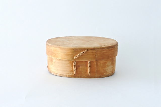 vintage voivakka B / ヴィンテージ 曲木の容器 B vakka (ヴァッカ) と呼ばれる小さなお弁当箱のような曲木の箱です。 主にアルダー材 (ハンノキ) で作られ、昼食用のバターを入れて持ち歩いたり、アクセサリーを保管したりする小物入れとして使われてきました。 接着剤を使わず、曲木の繋ぎ目はモミの木の根で縫い合わせ、蓋や底は木釘を打って固定しています。 側面底部に割れがあります。 size H 約6cm × W 約13.8cm × D 約9.5cm MADE IN FINLAND 実際に北欧の家庭で使用されていた古道具です。 特に気になる状態に関しましては商品説明と画像にてお伝えしていますが、使用感や傷、汚れや経年変化のあることをご理解の上でご購入頂けますようお願い致します。