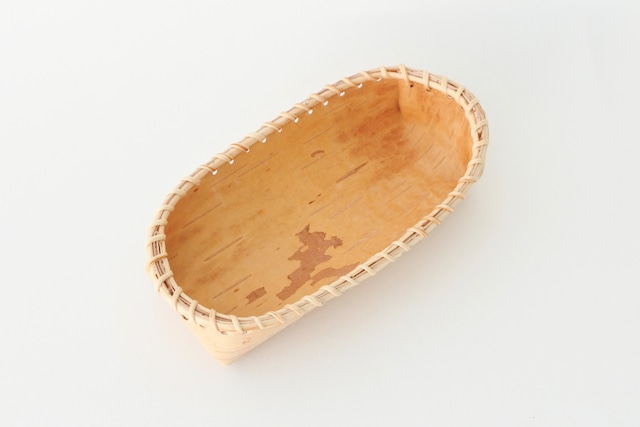 Näverslöjd Basket Oval 20mm L / 迫田 希久 白樺の樹皮のバスケット オーバル 20mm L スウェーデンで家具製作と白樺の樹皮細工を学ばれた迫田希久さん。 現在は奈良に工房を構え、直輸入した良質な材料を用いて製作をされています。 白樺の樹皮をテープ状にカットし編み込んだ後、根かがりという技法で縁に強度を持たせています。 ひと手間加えた丁寧な手仕事です。 白樺樹皮を使ったカゴは昔から北欧スウェーデンでは身近な暮らしの道具でした。 樹皮は耐水性に優れ、丈夫で革のような手触り。 手入れをしながら長く使うほどに色艶が増し、味わい深く育ちます。 材料特有の小さなコブや傷があります。 size H 約7.5cm × W 約29cm × D 約20cm 〈お手入れについて〉 白樺は水に強い樹皮です。 カゴが黒ずんだり、汚れた場合、柔らかいスポンジに水を含ませ優しく擦ってください。 流水で洗い流した後、タオルなどで水分を拭き取り、乾燥させてください。 その後、お手持ちのハンドクリームやボディクリーム(食品を入れる場合はオリーブオイルや食用油など)を薄く塗ってください。 樹皮が破けた場合、お直しも承っています。