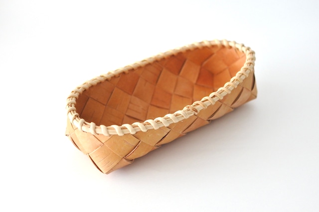 Näverslöjd Basket long / 迫田希久 白樺の樹皮のバスケット ロング スウェーデンで家具製作と白樺の樹皮細工を学ばれた迫田希久さん。 現在は奈良に工房を構え、直輸入した良質な材料を用いて製作をされています。 白樺の樹皮をテープ状にカットし編み込んだ後、根かがりという技法で縁に強度を持たせています。 ひと手間加えた丁寧な手仕事です。 デスクや食卓で邪魔にならないオーバル型を新しく製作していただきました。 白樺樹皮を使ったカゴは昔から北欧スウェーデンでは身近な暮らしの道具でした。 樹皮は耐水性に優れ、丈夫で革のような手触り。 手入れをしながら長く使うほどに色艶が増し、味わい深く育ちます。 材料特有の小さなコブや傷があります。 size H 約7.5cm × W 約16cmØ × D 約9cm 〈お手入れについて〉 白樺は水に強い樹皮です。 カゴが黒ずんだり、汚れた場合、柔らかいスポンジに水を含ませ優しく擦ってください。 流水で洗い流した後、タオルなどで水分を拭き取り、乾燥させてください。 その後、お手持ちのハンドクリームやボディクリーム(食品を入れる場合はオリーブオイルや食用油など)を薄く塗ってください。 樹皮が破けた場合、お直しも承っています。