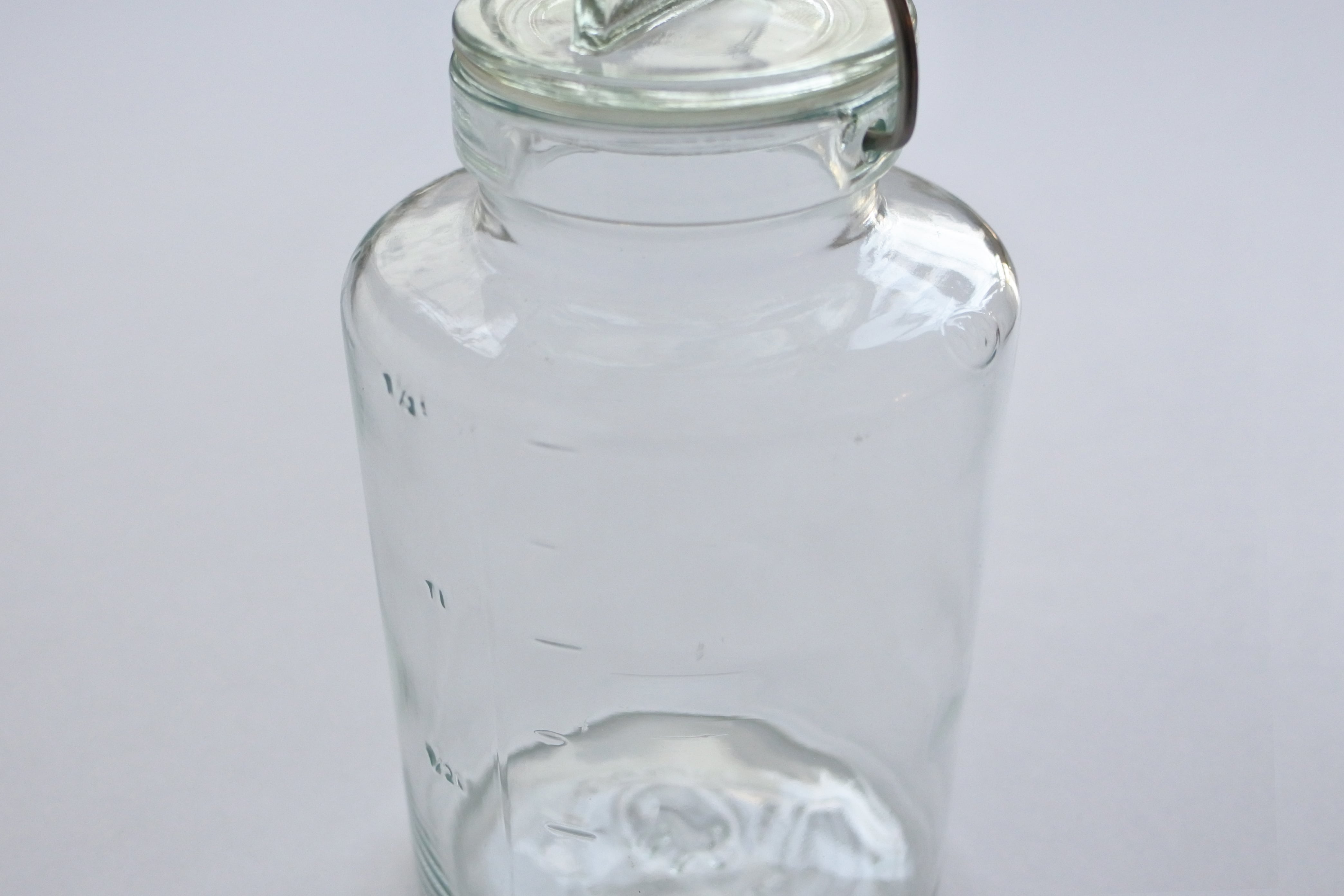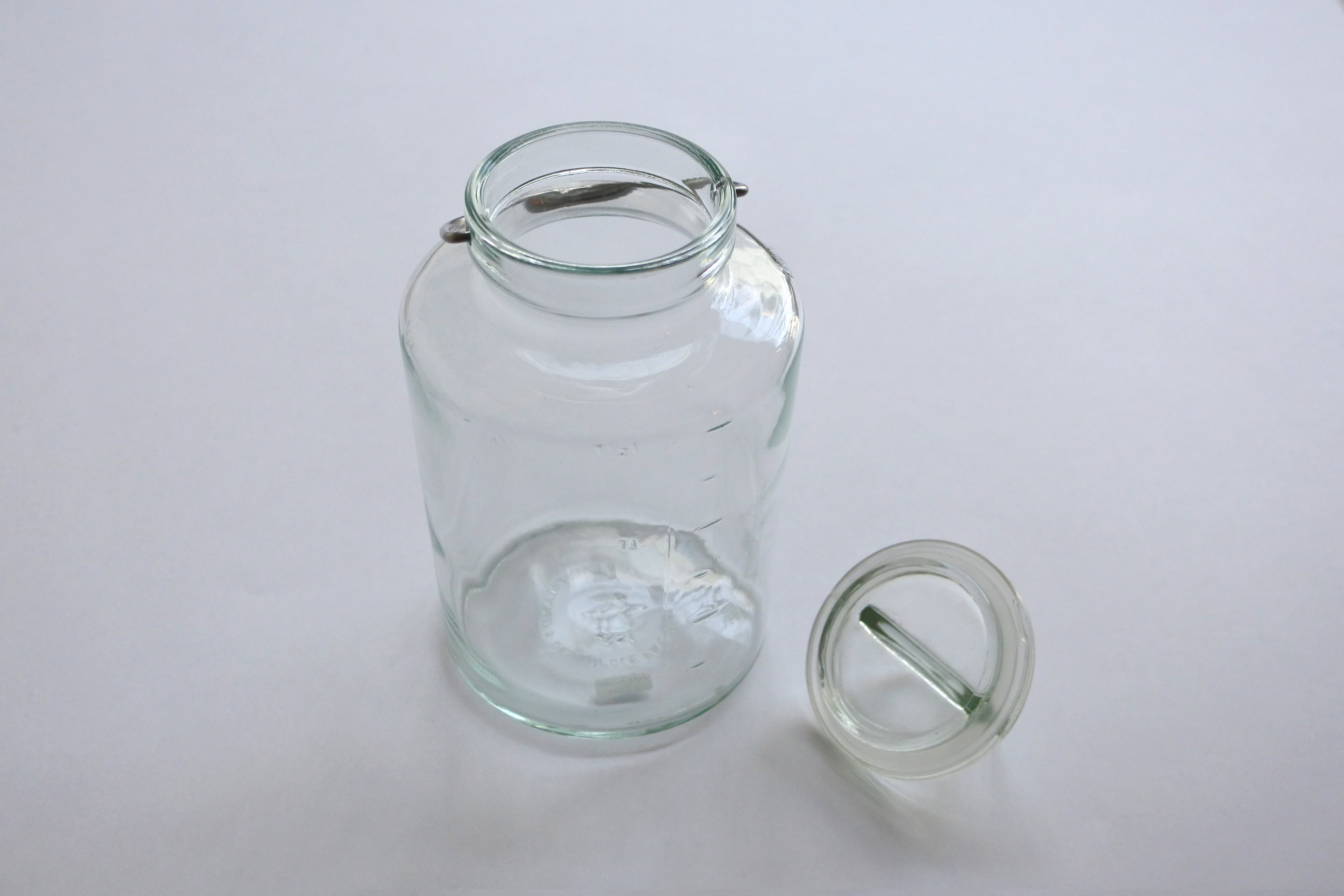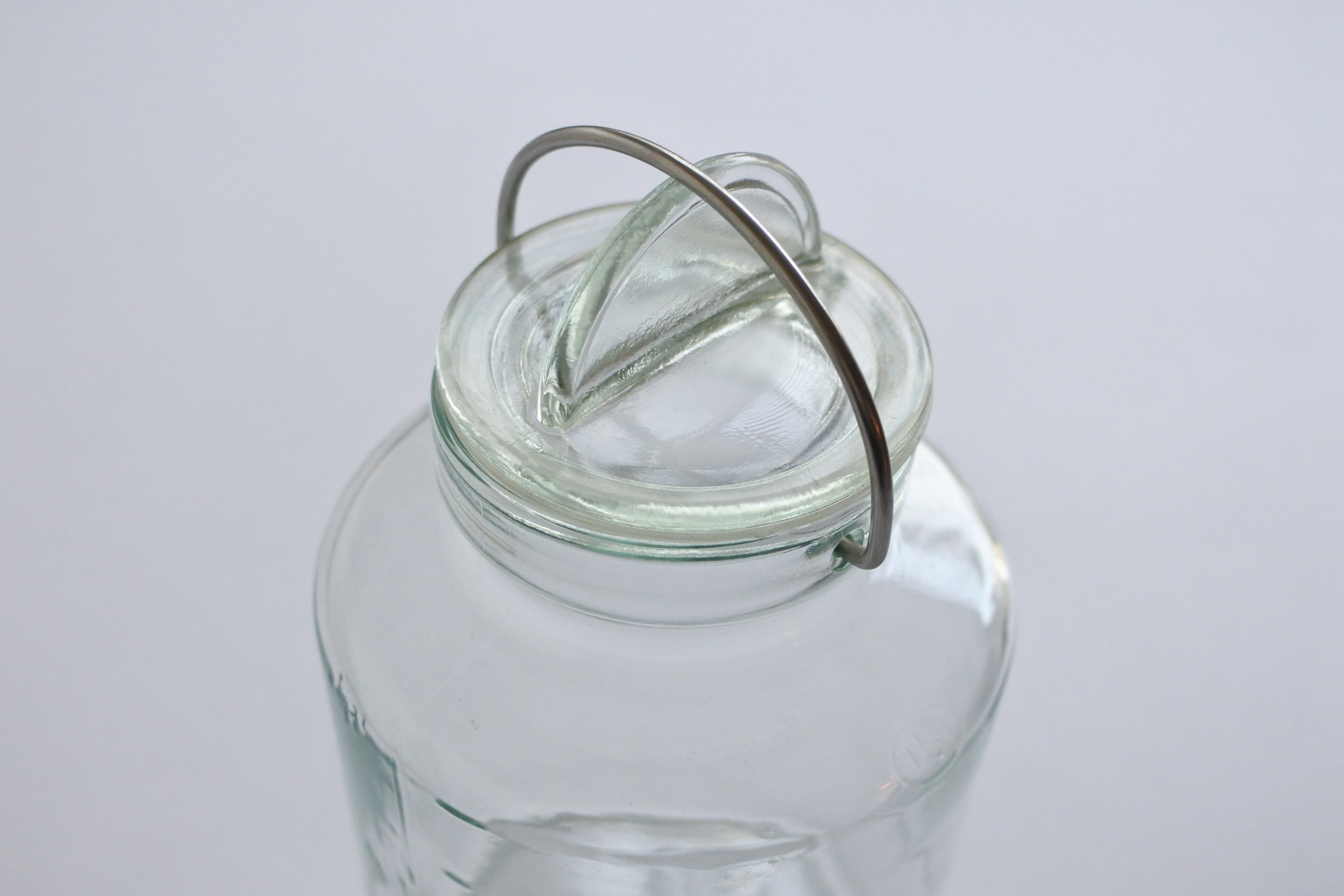 ステンレスの留め金でガラス蓋を押さえるタイプの密閉できる保存瓶。