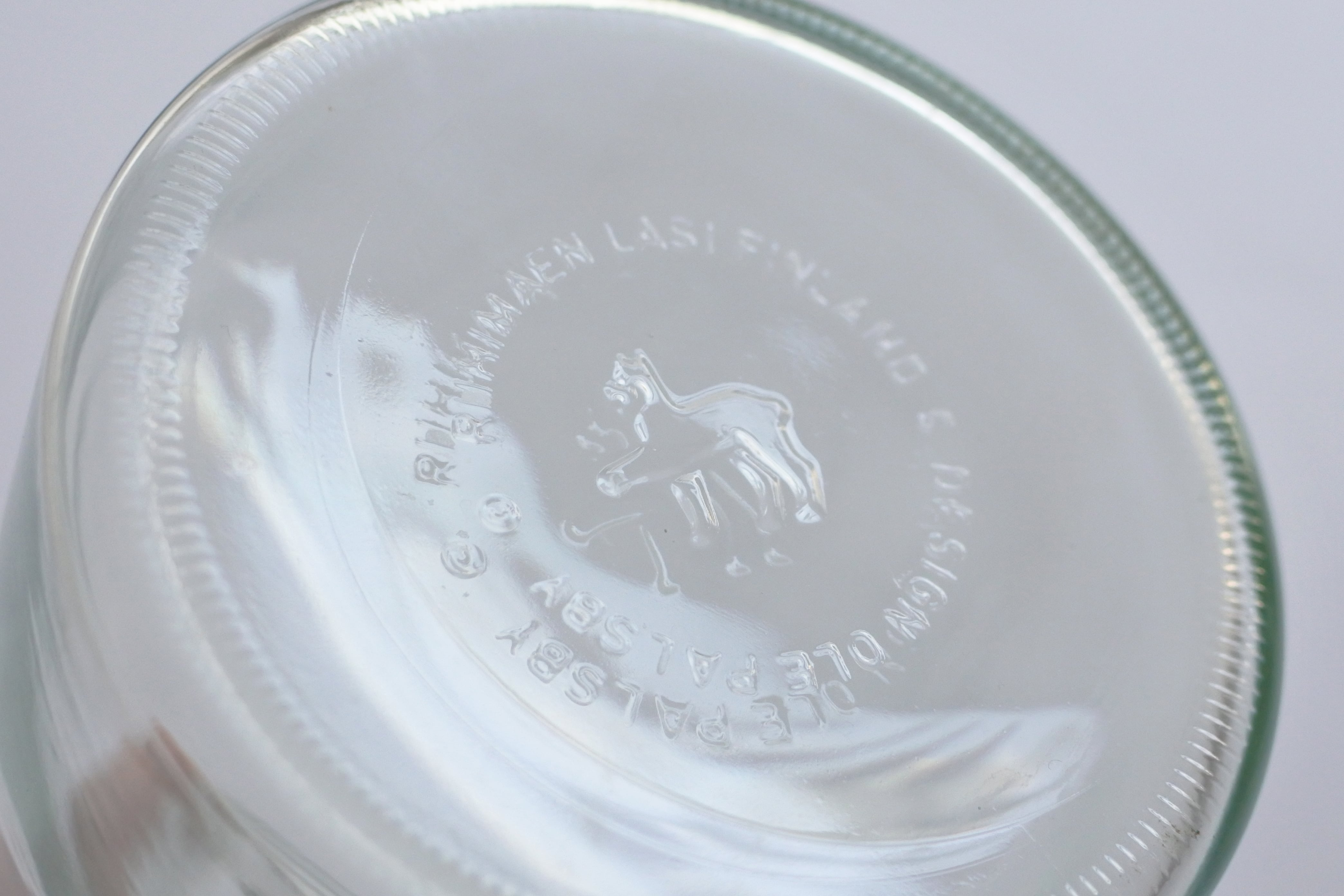 側面には250ml刻みの目盛りと1/2L、1L、1 1/2Lのエンボス、裏面にはオオヤマネコのロゴマークとRIIHIMÄEN LASI FINLAND DESIGN OLE PALSBY のエンボスがあります。