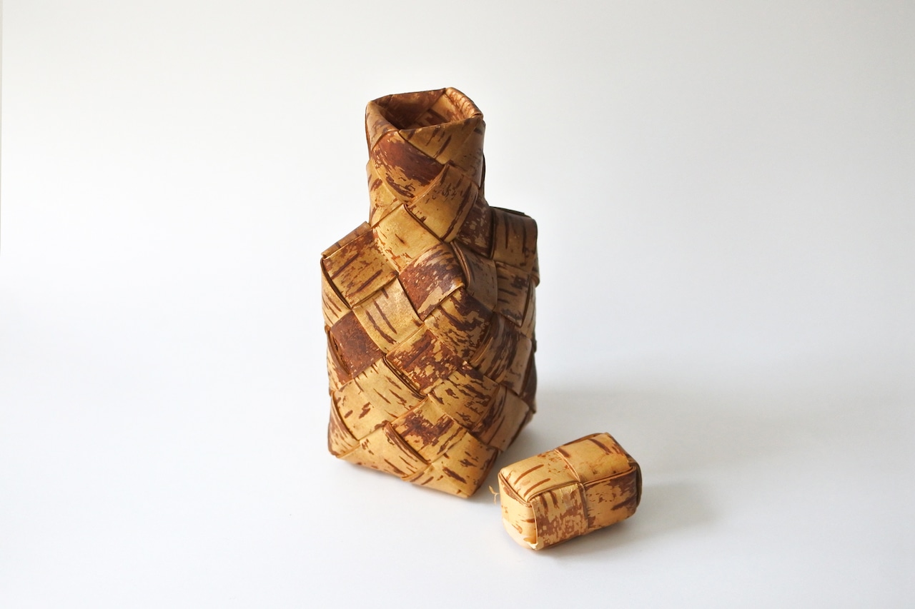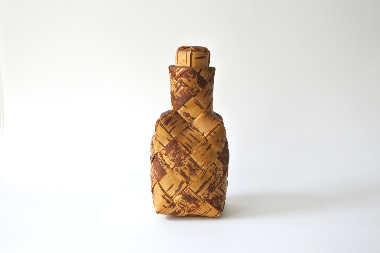 フィンランドの蚤の市で見つけた古い白樺樹皮細工の蓋付きボトルです。