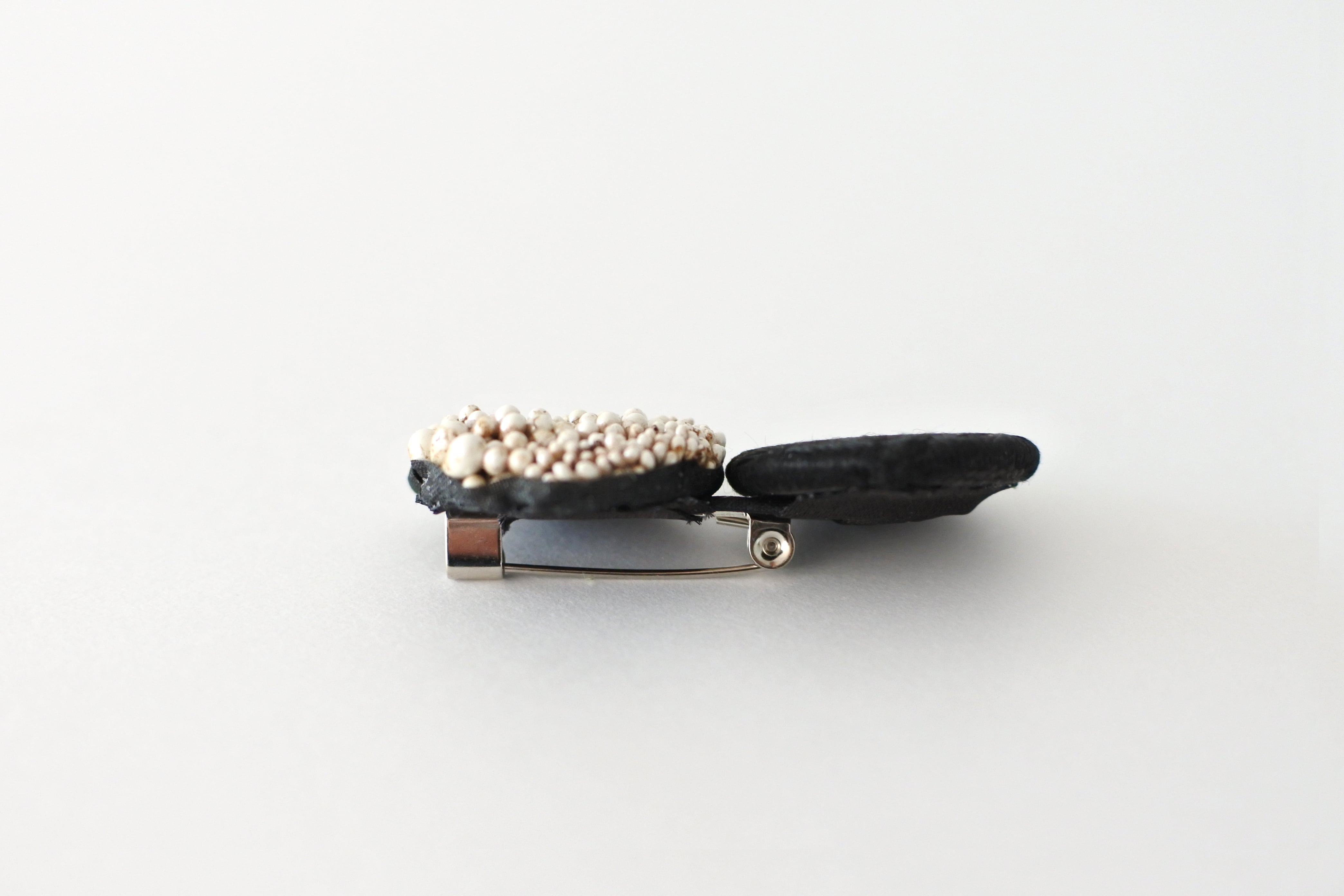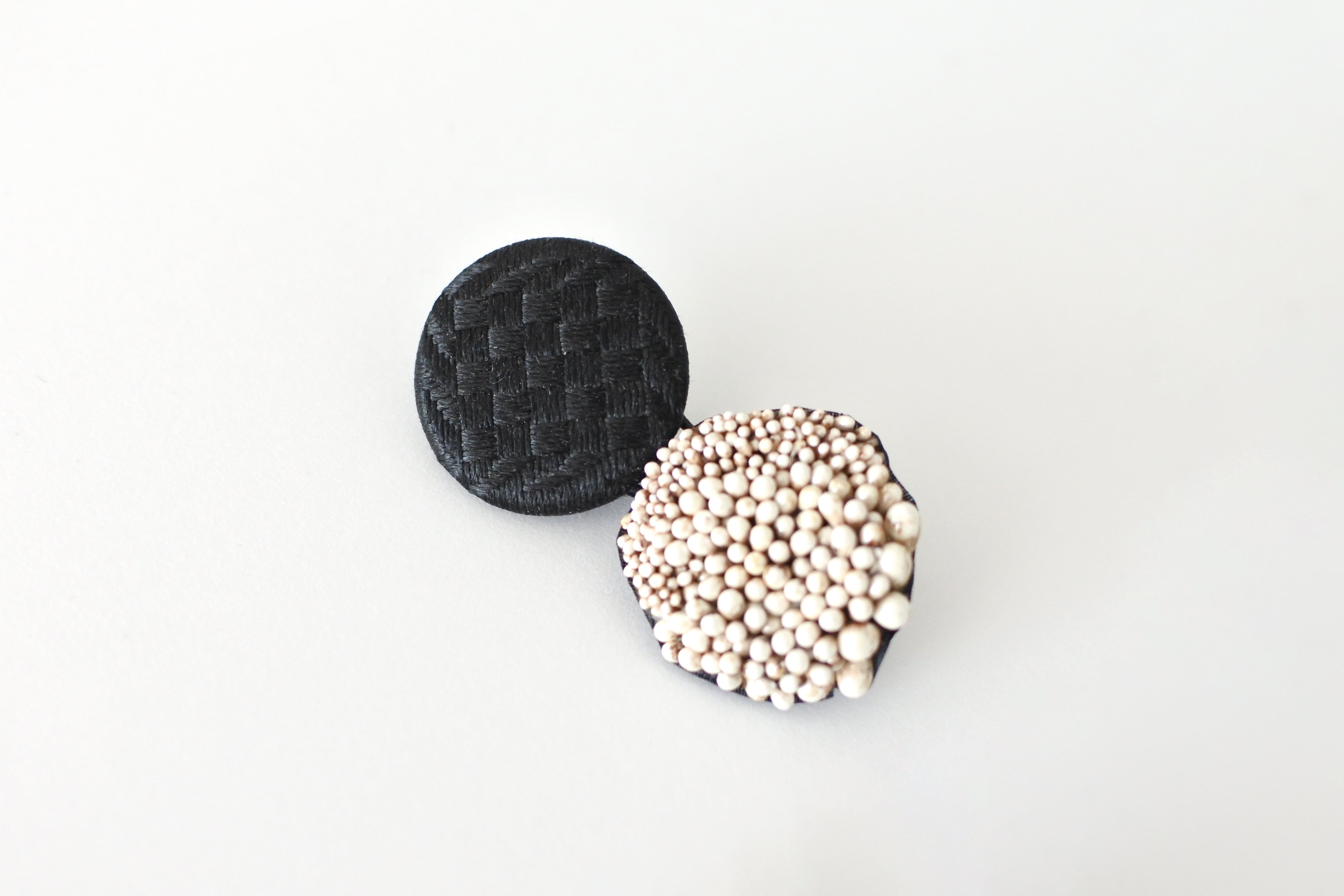 黒い織柄のアンティークボタンにパール感が出るように染めたペップを組み合わせました。