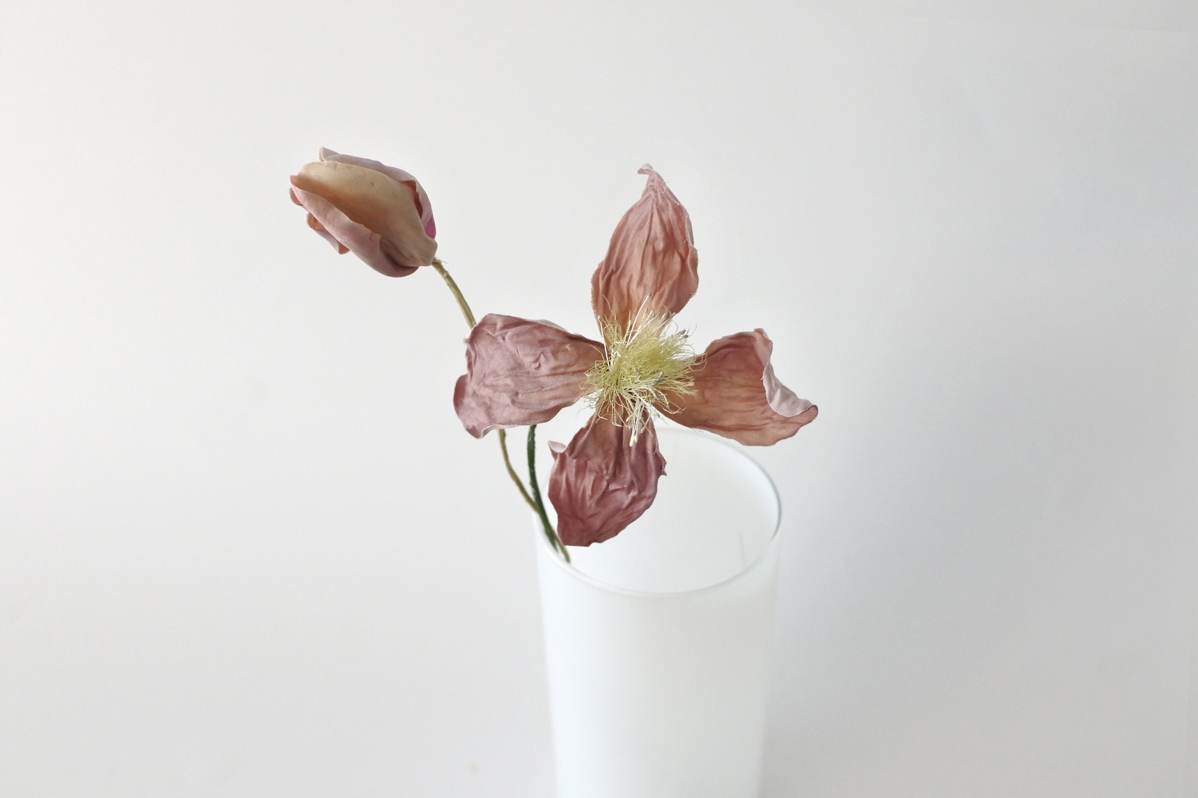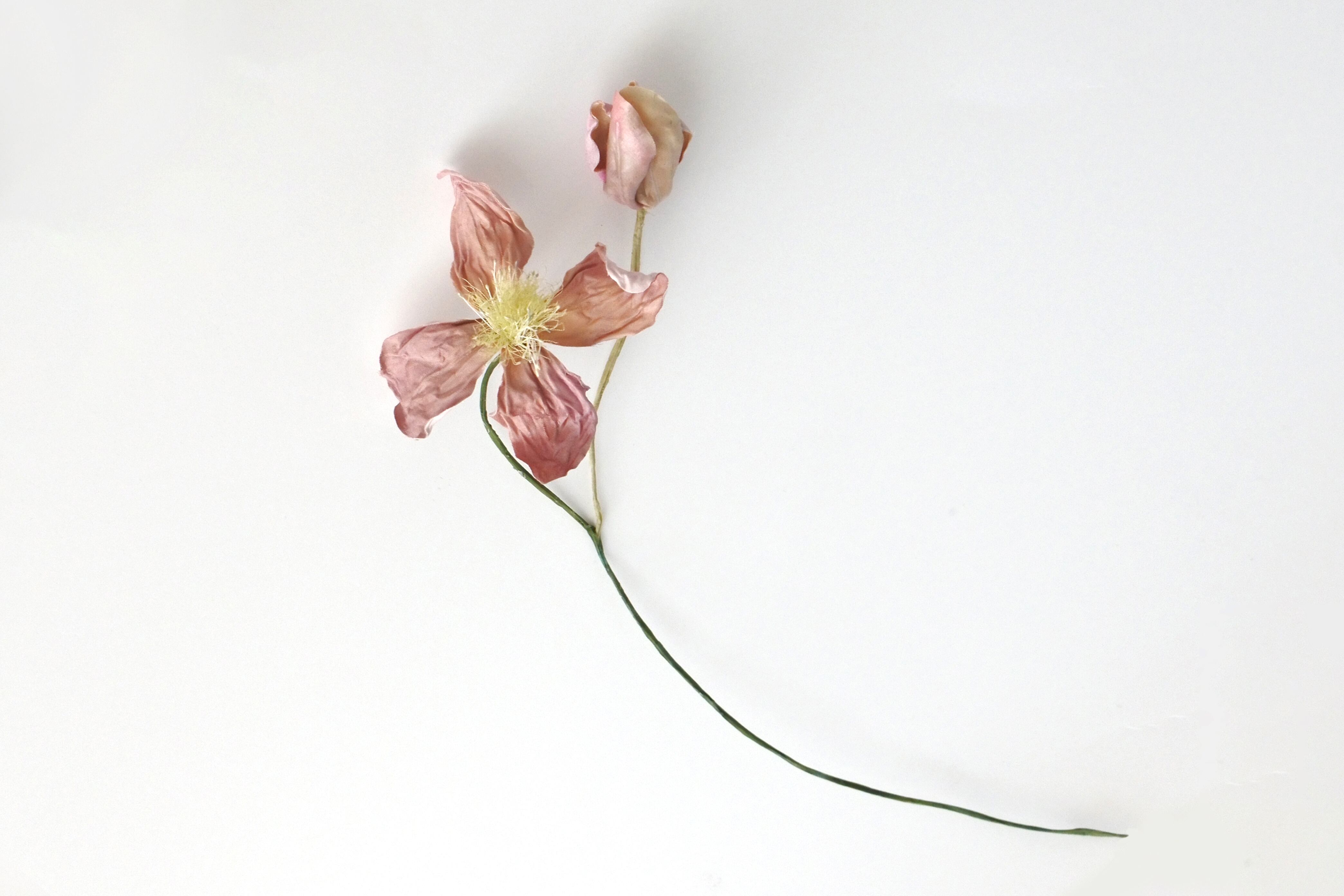 繊細な花びらを持つクレマチスが、アンティークな風合いのドライになった様子を染め花に仕立てました。