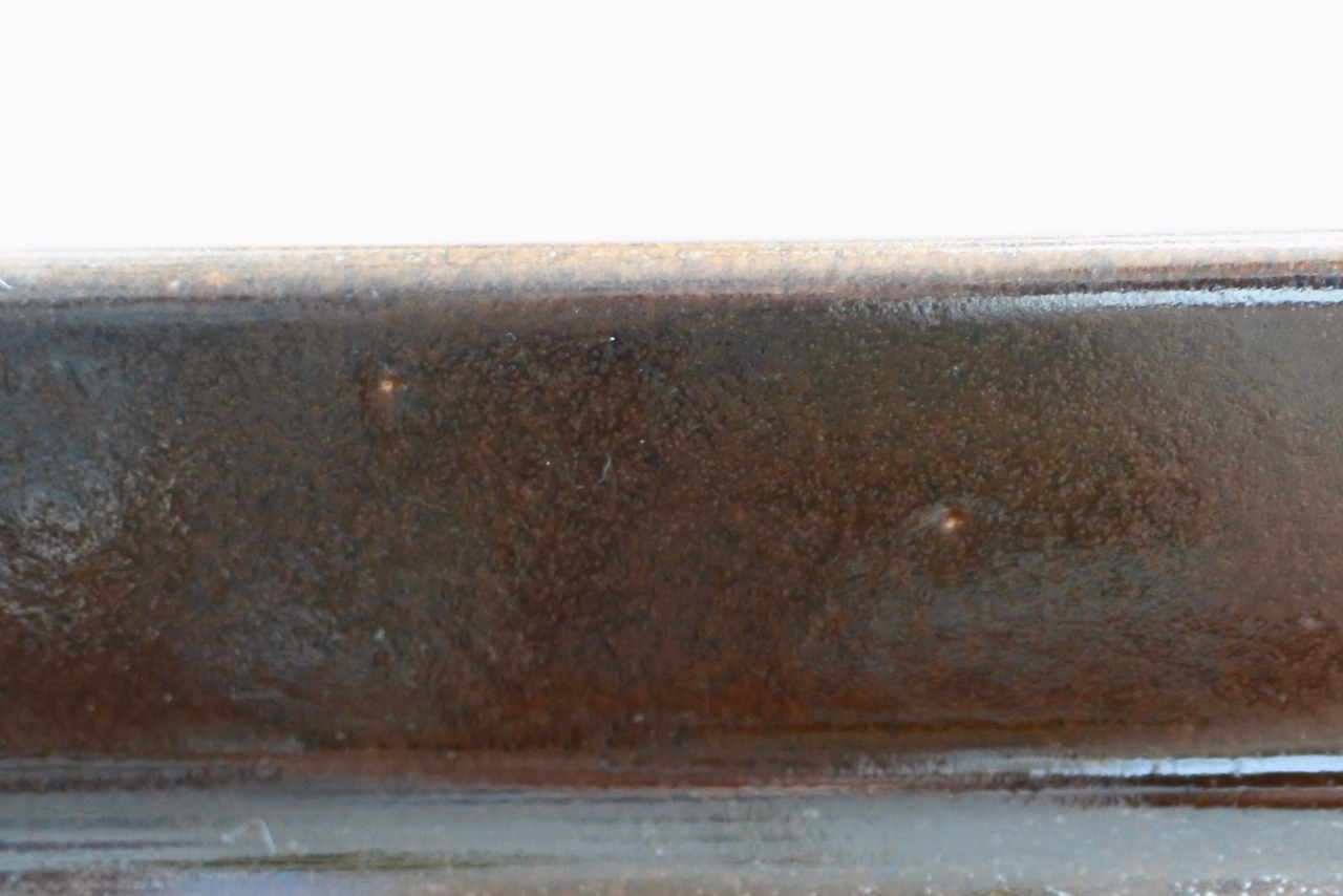 多少の傷やスレ、何箇所か製造過程で出来たピンホール、裏面に二箇所欠けがあります。