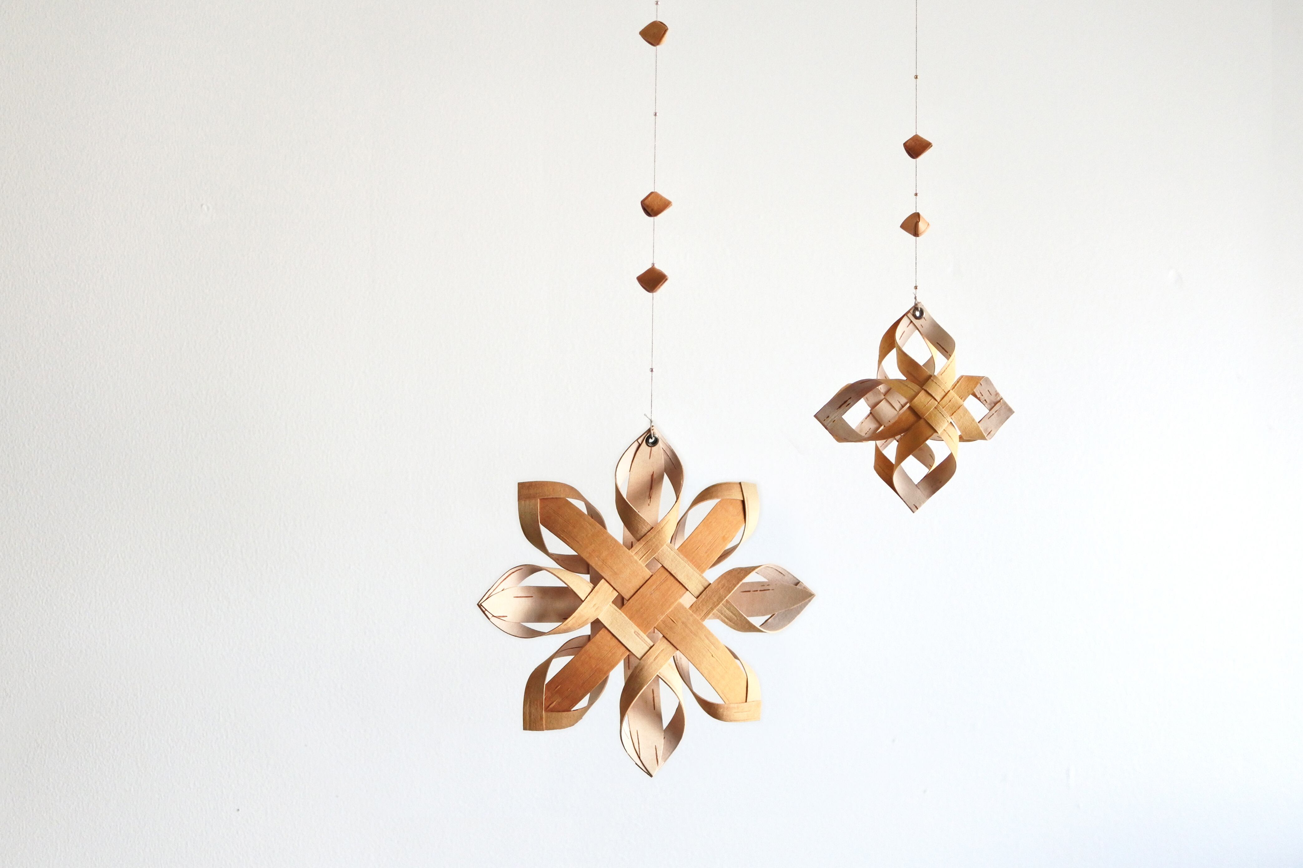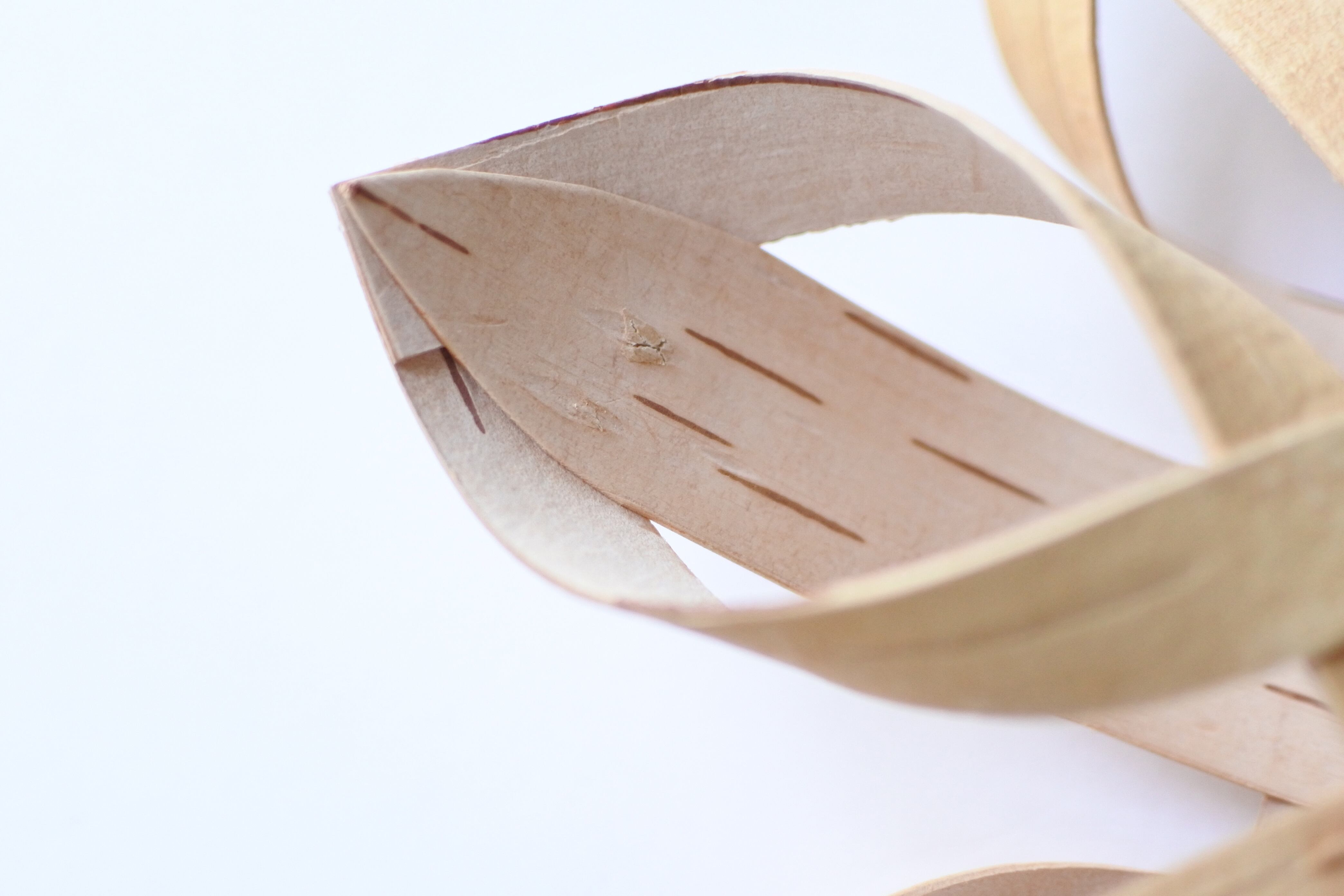 白樺の樹皮をテープ状にカットし立体的なオーナメントに仕上げました。