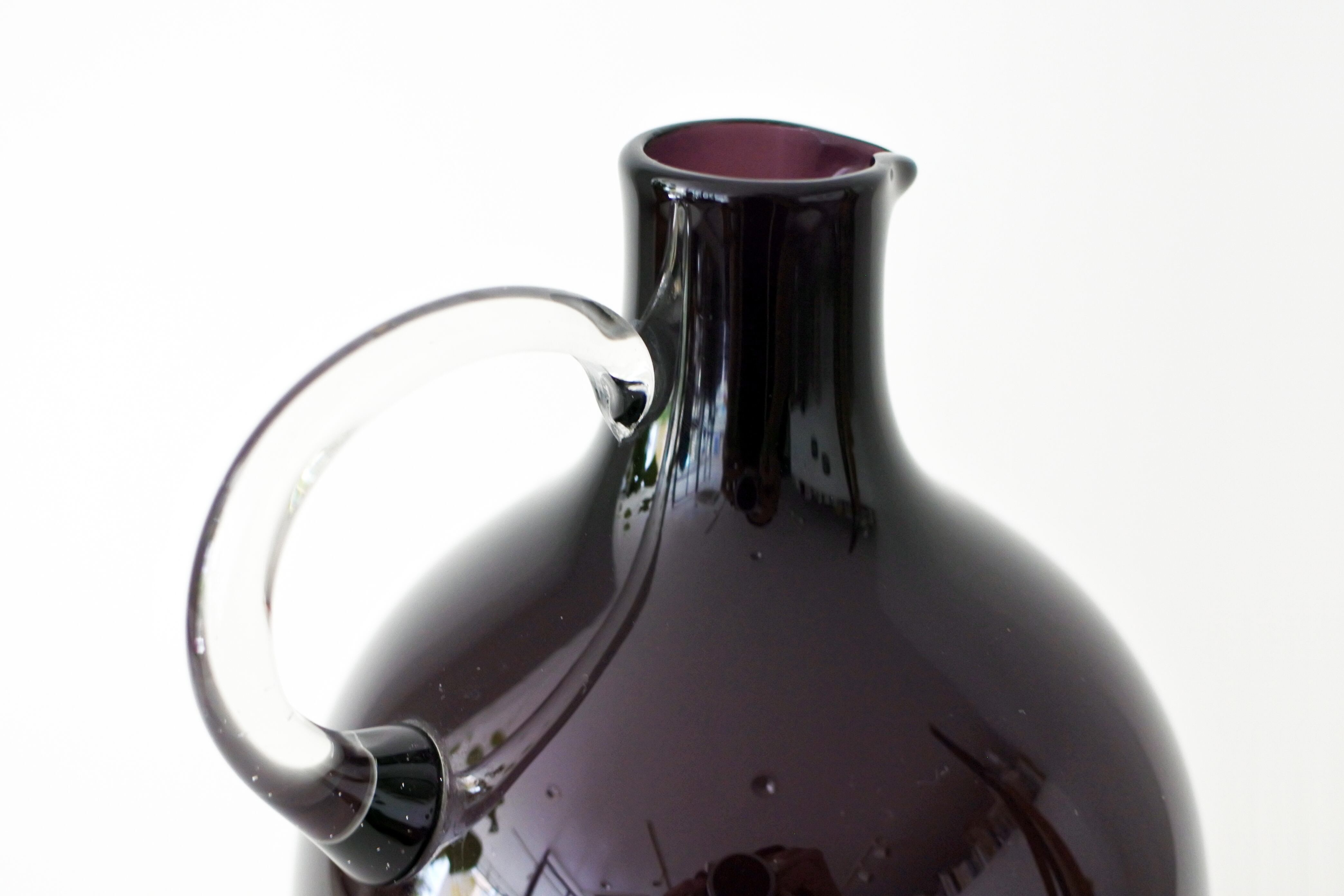 職人の手によって吹きガラスの技法で作られた深いパープルのデキャンタとショットグラス6個のセット。