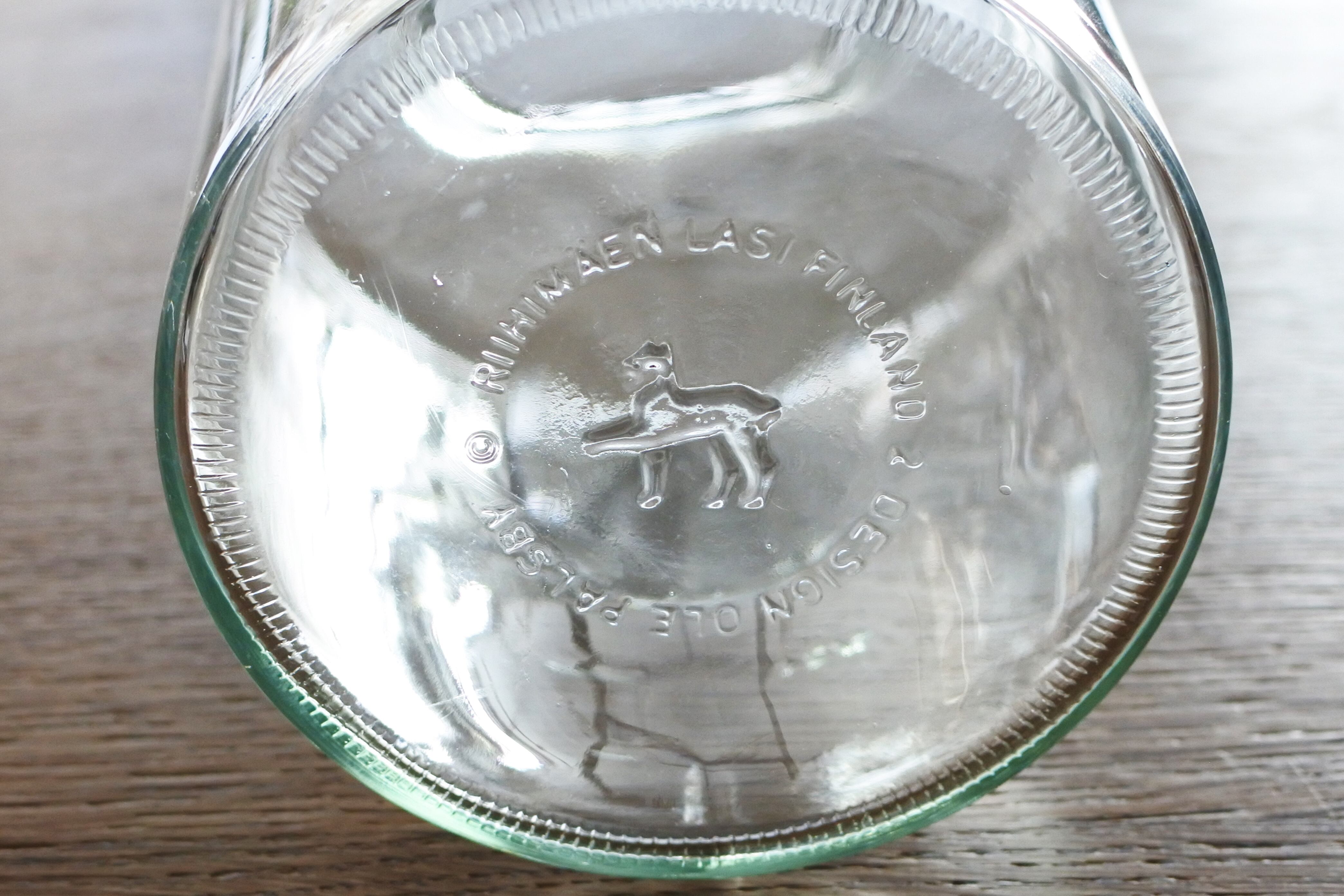 側面には250ml刻みの目盛りと1/2L、1L1 1/2Lのエンボス、裏面にはオオヤマネコのロゴマークとRIIHIMÄEN LASI FINLAND DESIGN OLE PALSBY のエンボスがあります。